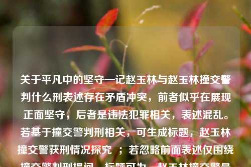 关于平凡中的坚守—记赵玉林与赵玉林撞交警判什么刑表述存在矛盾冲突,前者似乎在展现正面坚守,后者是违法犯罪相关,表述混乱。若基于撞交警判刑相关,可生成标题,赵玉林撞交警获刑情况探究 ;若忽略前面表述仅围绕撞交警判刑提问,标题可为,赵玉林撞交警最终判处何种刑罚 。你可明确需求或纠正表述,以便更好生成合适标题。